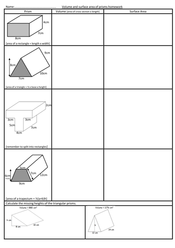 Below are six versions of our grade 6 math worksheet on finding the volume and surface areas of rectangular prisms. Show your work in the blank space to the right of each problem. Finding the surface area of a triangular prism.