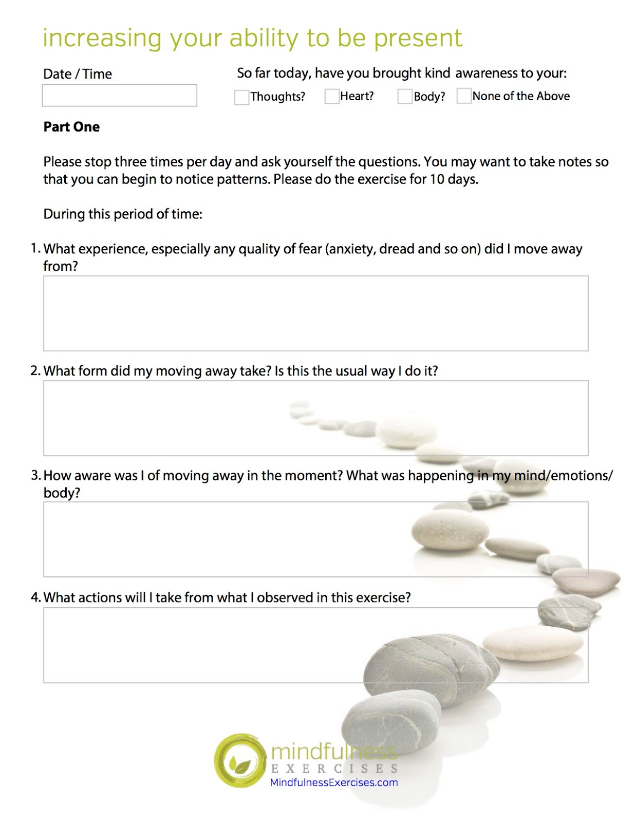 The doc/pdfs include introduction to mindfulness, mindfulness of the breath. Mindfulness worksheets and guided meditation scripts. Mindfulness is a type of meditation in which you focus on being intensely aware of what you're practicing mindfulness exercises can help you direct your attention away from this kind of thinking. Free mindfulness worksheets for therapists to download.