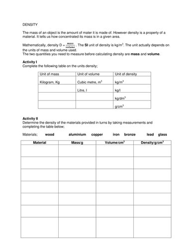 Download Density Worksheet Gif. 4) a metal cylinder is placed in a graduated cylinder which has been filled with water to the 70.0 ml mark. If gold has a density of 19.3 g/cm3, calculate the mass of the gold cube.