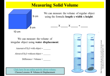 ( be sure to read the meniscus) record a starting water level of 50 on your worksheet. One milliliter (1 ml) of water has a volume of 1 cubic centimeter (1cm3). This video shows how to use the water displacement method. Finding volume using an overflow can (pdf).